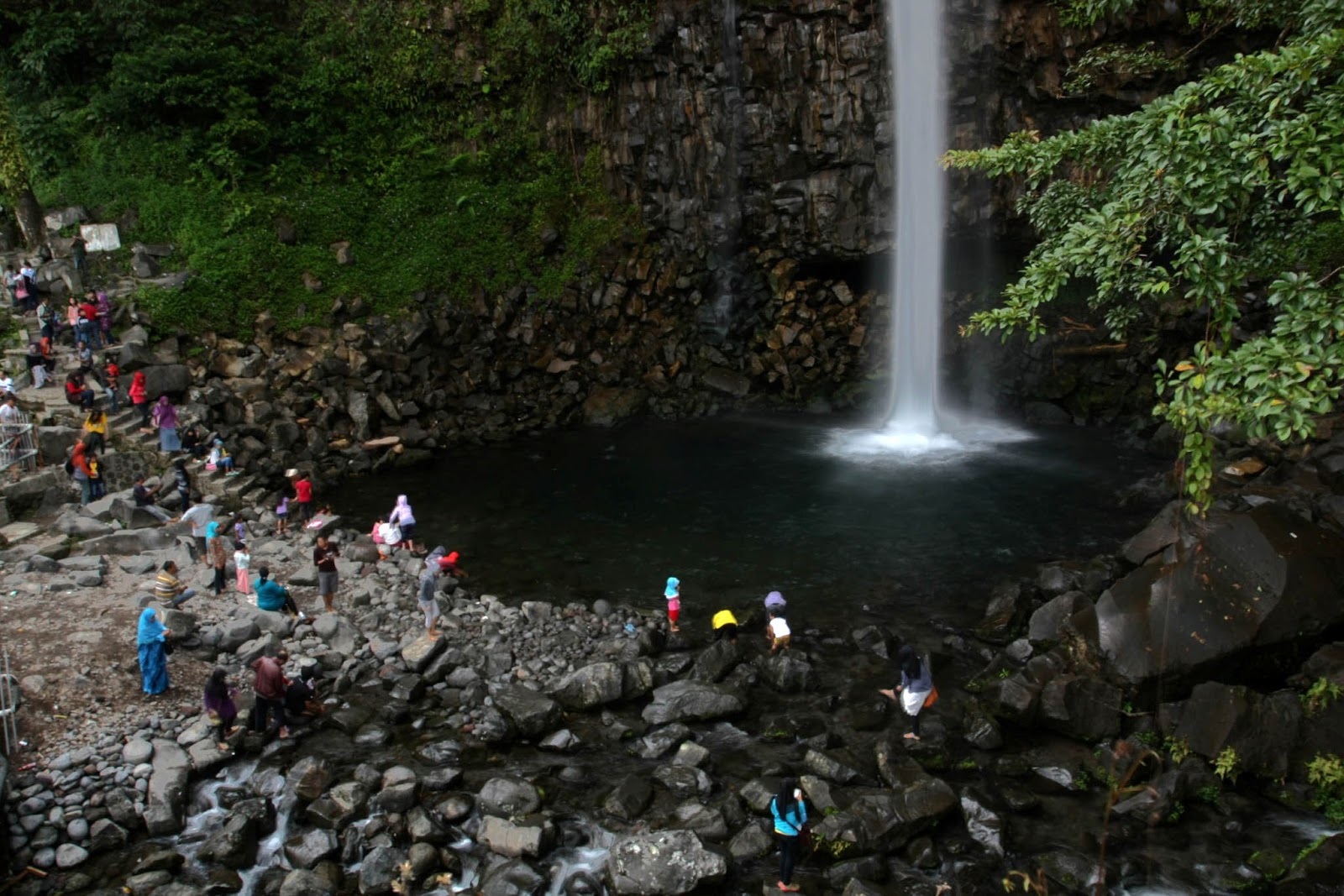 Di sebelah kanan dan kiri jalan kita dapat menyaksikan lembah dan bukit yang menghijau ditumbuhi aneka pohon. Di bawah air terjun terdapat kolam yang cukup luas. Airnya jernih dan tampak menghijau ketika terkena sinar matahari. Jika dilihat secara kasatmata, tampaknya kolam cukup dalam.